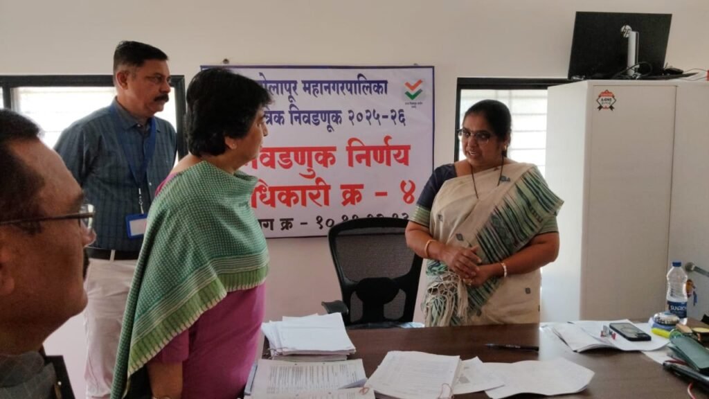 सोलापूर दि. 2 : सोलापूर महानगरपालिका सार्वत्रिक निवडणूक २०२५–२६ च्या अनुषंगाने आज मा. मुख्य निवडणूक निरीक्षक नयना गुंडे (आयुक्त, महिला व बाल विकास विभाग, पुणे)तसेच निवडणूक निरीक्षक मलिकार्जून माने (अपर जिल्हाधिकारी, सातारा) यांनी सोलापूर शहरातील नॉर्थकोट प्रशाला येथे स्थापन करण्यात आलेल्या निवडणूक निर्णय अधिकारी क्रमांक १ ते ७ यांच्या कार्यालयांना तसेच आचारसंहिता कक्षास भेट देऊन सविस्तर पाहणी केली.