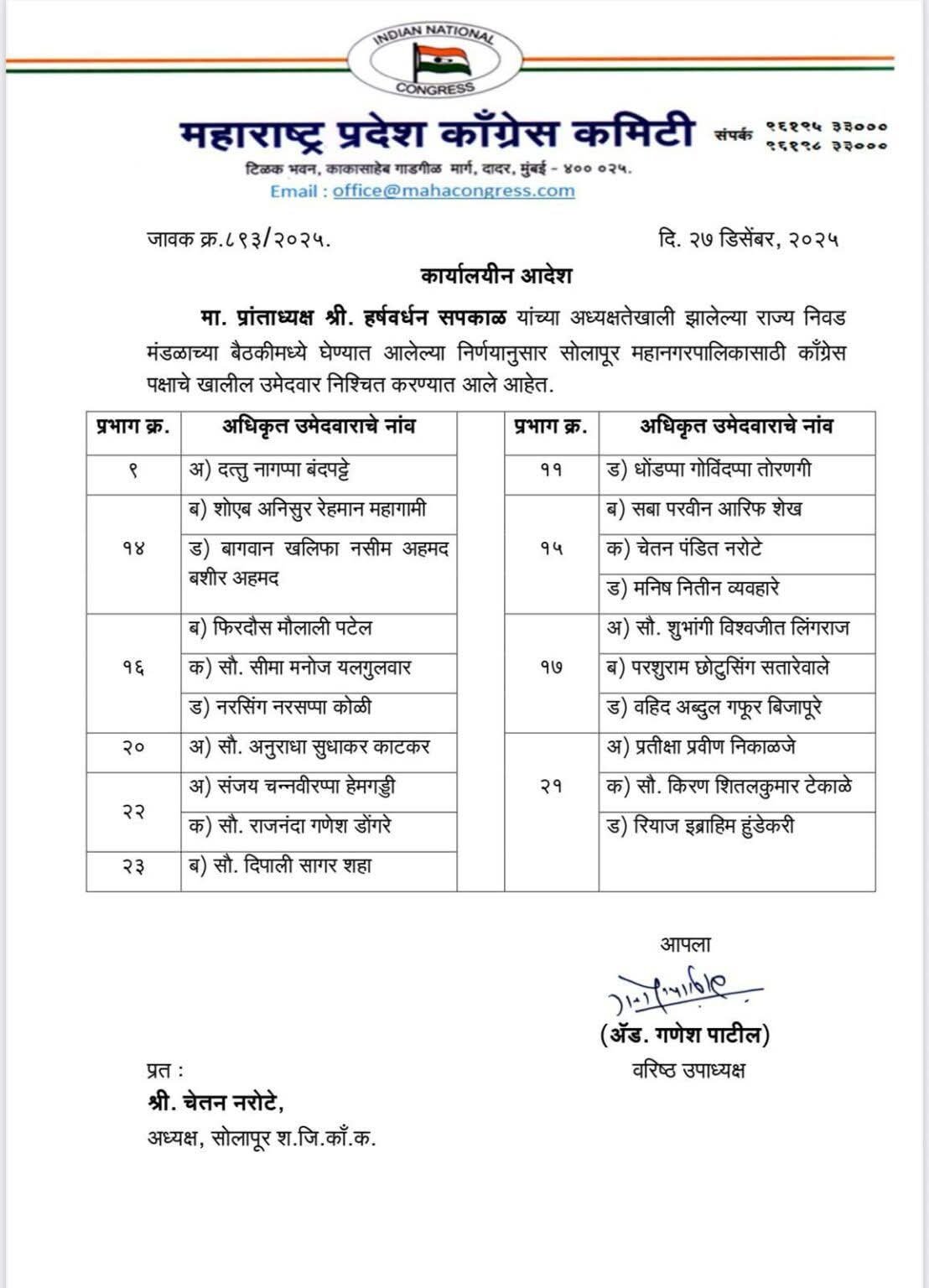 सोलापूर : सोलापूर महानगरपालिका निवडणुकीसाठी काँग्रेसने आपली पहिली यादी जाहीर केली आहे. यात शहराध्यक्ष चेतन नरोटे यांचे सह इतर माजी नगरसेवकांचा समावेश आहे.