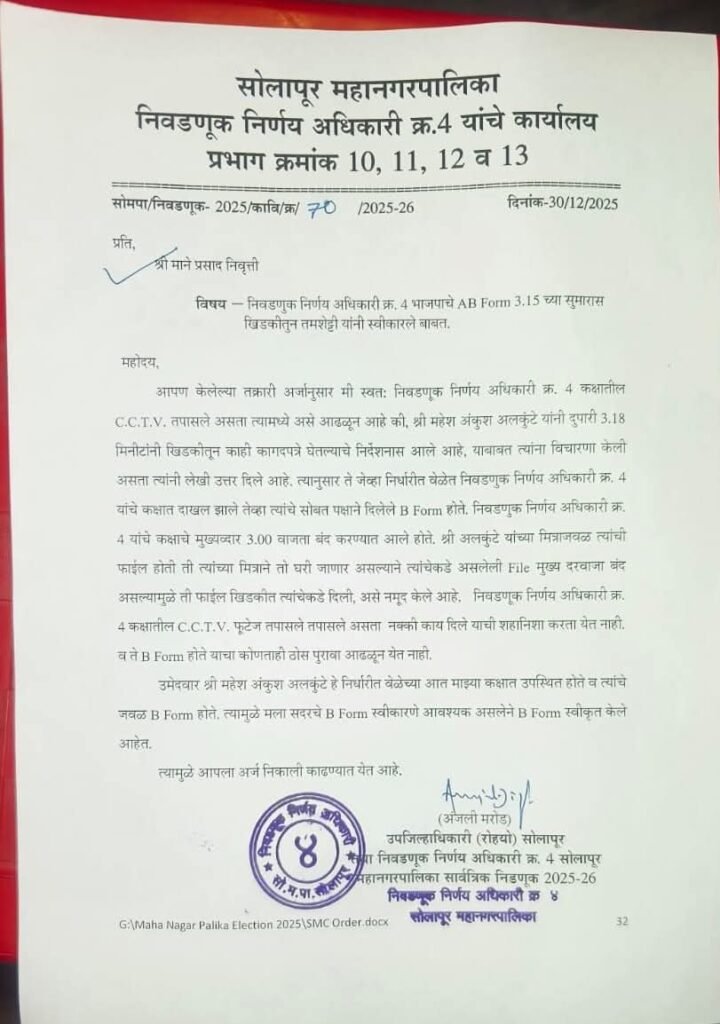 सोलापूर भाजप एबी फॉर्म गोंधळ ; निवडणूक निर्णय अधिकारी 4 यांचे स्पष्टीकरण ; पत्र सोशल मीडियावर व्हायरल
