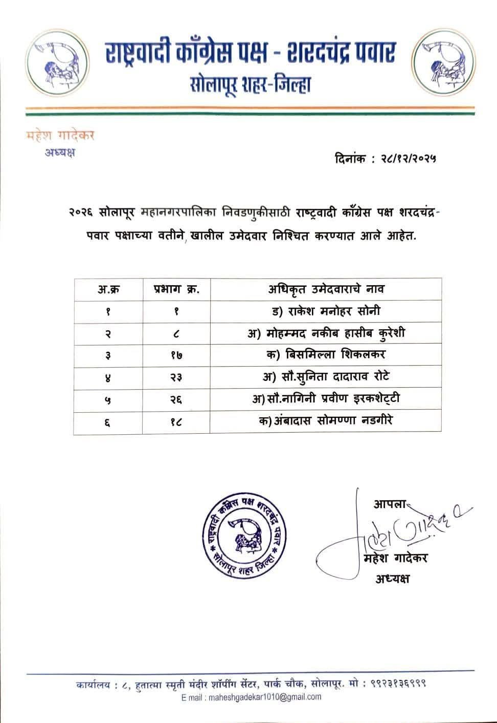 सोलापूर दि. 28 : शहर राष्ट्रवादी काँग्रेस पार्टी शरदचंद्र पवार पक्षाच्या वतीने महापालिका निवडणुकीसाठी पहिली यादी जाहीर करण्यात आली आहे. या यादीत सहा नावांचा समावेश आहे.
