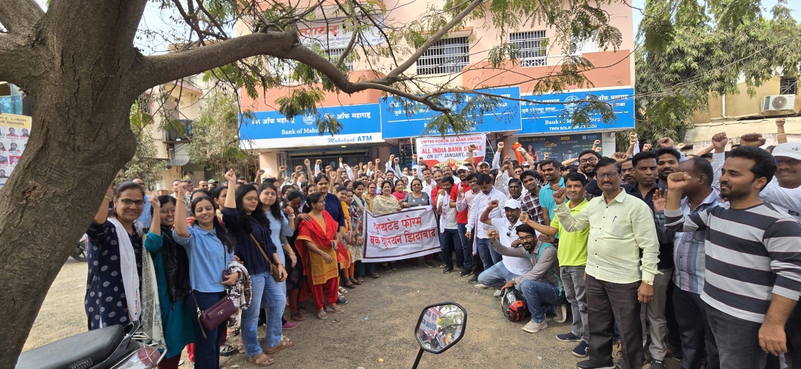 सोलापूर दि. 27 : पाच दिवसाचा आठवडा बँकांना त्वरित लागू करावा यासाठी युनायटेड फोरम ऑफ बँक युनियनने पुकारलेल्या देशव्यापी संपाचा भाग म्हणून सोलापुरातही बँक ऑफ महाराष्ट्र जुळे सोलापूर येथे सोलापुरातील बँकांच्या सर्व युनियनसने एकत्र येऊन व्यवस्थापनाचा निषेध व्यक्त केला.