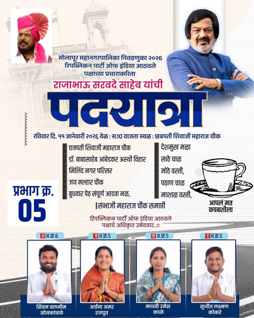 सोलापूर दि. 10 : रिपब्लिकन पार्टी ऑफ इंडिया आठवले पक्षाचे सोलापूर महानगरपालिका सार्वत्रिक निवडणुकीचे प्रभाग पाचचे अधिकृत उमेदवार शिवम बलभीम सोनकांबळे, अर्चना अमर रजपूत, माधवी उमेश काळे, सुजीत लक्ष्मण कोकरे यांच्या प्रचारार्थ महाराष्ट्र प्रदेश अध्यक्ष राजाभाऊ सरवदे यांची भव्य पदयात्रा आयोजित करण्यात आली आहे.