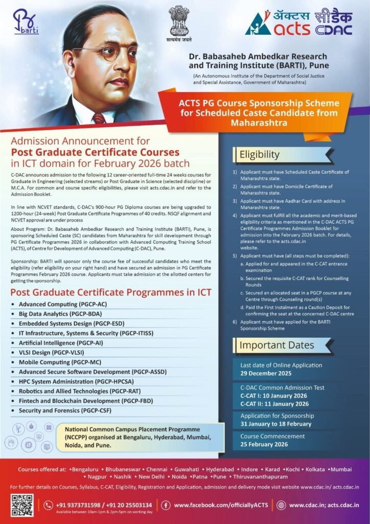 पुणे दि. 25 : डॉ. बाबासाहेब आंबेडकर संशोधन व प्रशिक्षण संस्था (बार्टी), पुणे—सामाजिक न्याय व विशेष सहाय्य विभाग, महाराष्ट्र शासनाची स्वायत्त संस्था यांच्या वतीने महाराष्ट्रातील अनुसूचित जाती (SC) प्रवर्गातील विद्यार्थ्यांसाठी पीजी सर्टिफिकेट प्रोग्रॅम २०२६ अंतर्गत कौशल्य विकासासाठी प्रायोजकत्व जाहीर करण्यात आले आहे. हा उपक्रम सेंटर फॉर डेव्हलपमेंट ऑफ अॅडव्हान्स्ड कम्प्युटिंग (सी-डॅक), पुणे येथील अॅडव्हान्स्ड कम्प्युटिंग ट्रेनिंग स्कूल (ACTS) यांच्या सहकार्याने राबविण्यात येणार आहे.