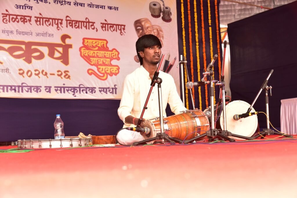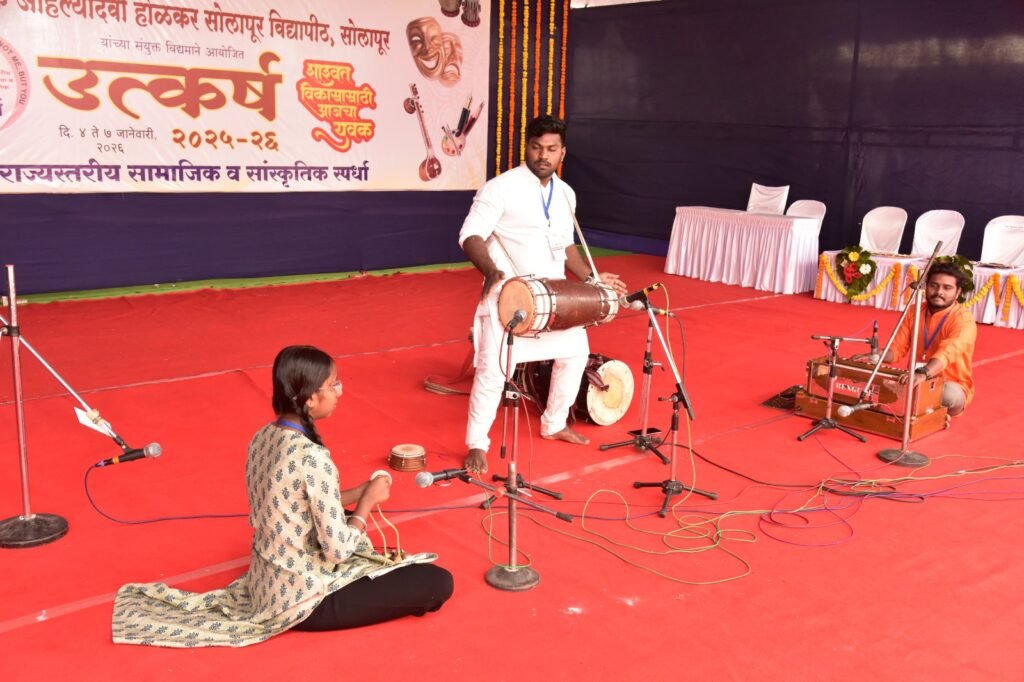 सोलापूर, दि. 6 : महाराष्ट्र राज्याच्या उच्च व तंत्र शिक्षण विभागांतर्गत राष्ट्रीय सेवा योजना कक्ष व पुण्यश्लोक अहिल्यादेवी होळकर सोलापूर विद्यापीठ यांच्या संयुक्त विद्यमाने आयोजित १६ व्या राज्यस्तरीय ‘उत्कर्ष’ सामाजिक व सांस्कृतिक महोत्सवात सोमवारी लोककलेच्या सादरीकरणातून समाजप्रबोधनाचा जागर करण्यात आला. पोवाडा, भारुड, अभंग, संकल्पना नृत्य आणि लोकवाद्यांच्या तालावर विद्यापीठ परिसर सांस्कृतिक उत्साहाने भारावून गेला.