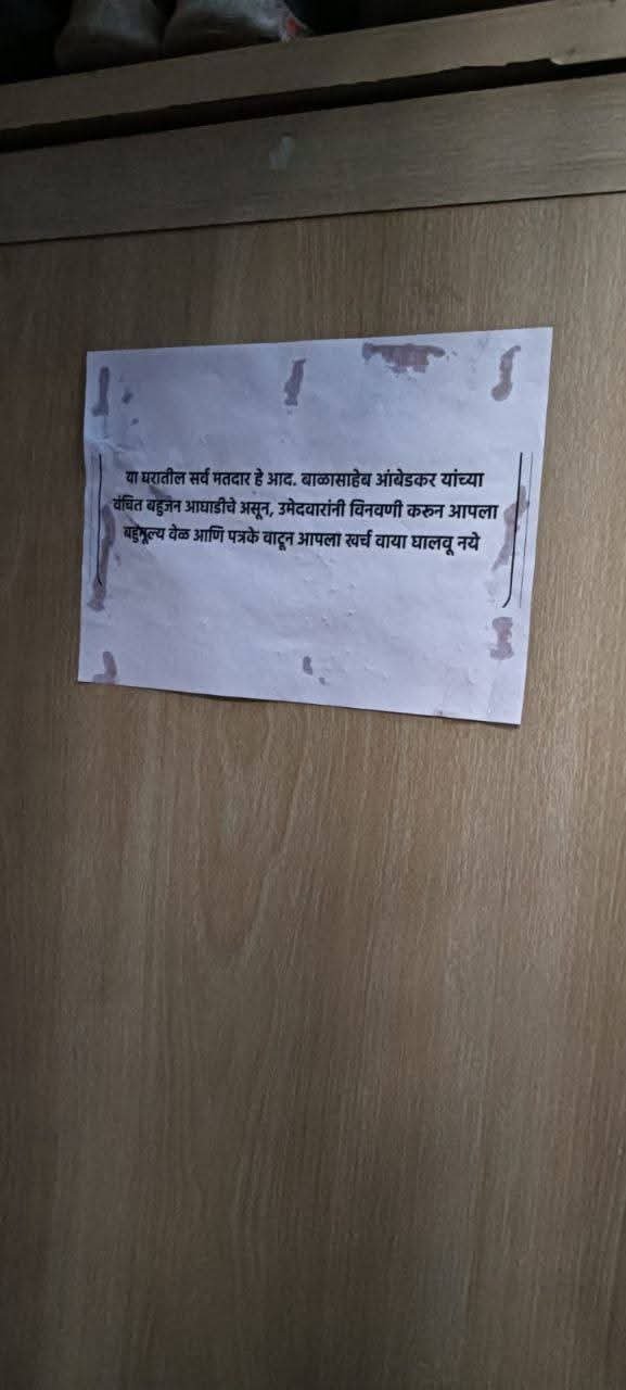नेमका मजकूर काय? पुण्यातील एका घरावर लावलेली ही पाटी सध्या सोशल मीडियावर व्हायरल होत आहे. “या घरातील सर्व मतदार हे आद. बाळासाहेब आंबेडकर यांच्या वंचित बहुजन आघाडीचे असून, उमेदवारांनी विनवणी करून आपला बहुमूल्य वेळ आणि पत्रके वाटून आपला खर्च वाया घालवू नये.