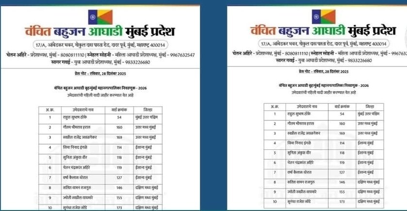 मुंबई दि. 28 : आगामी बृहन्मुंबई महानगरपालिका निवडणूक २०२६ साठी वंचित बहुजन आघाडीने आपली कंबर कसली असून, उमेदवारांची पहिली अधिकृत यादी जाहीर केली. पक्षाचे राष्ट्रीय अध्यक्ष ॲड. प्रकाश आंबेडकर यांच्या मार्गदर्शनाखाली मुंबईतील विविध प्रभागांतील १० नावांची घोषणा करण्यात आली असून, यामध्ये नव्या निष्ठावान कार्यकर्त्यांना संधी देण्यात आली आहे.