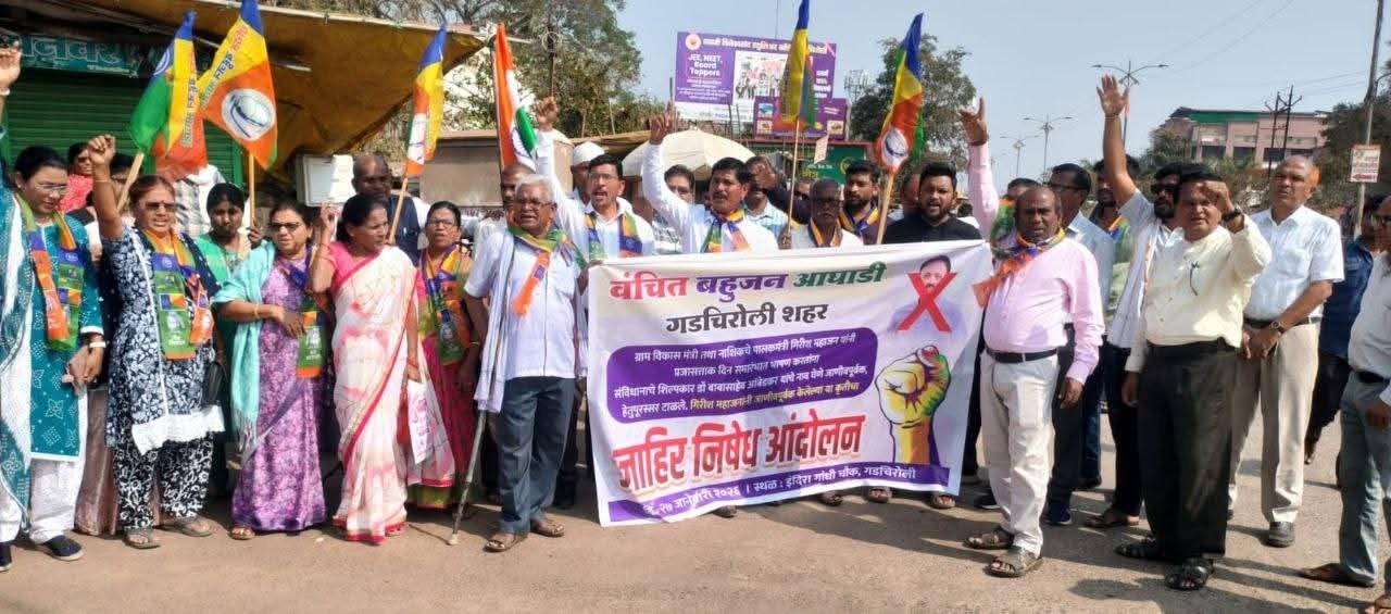 नाशिक येथील प्रजासत्ताक दिन सोहळ्यात राज्याचे ग्रामविकास मंत्री तथा पालकमंत्री गिरीश महाजन यांनी आपल्या भाषणातून भारतीय राज्यघटनेचे शिल्पकार डॉ. बाबासाहेब आंबेडकर यांचे नाव जाणीवपूर्वक टाळल्याचा आरोप करत, गडचिरोलीत वंचित बहुजन आघाडीच्या वतीने तीव्र निदर्शने करण्यात आली. येथील स्थानिक इंदिरा गांधी चौकात जमलेल्या कार्यकर्त्यांनी गिरीश महाजन यांच्याविरोधात जोरदार घोषणाबाजी करत त्यांच्यावर ‘अॅट्रॉसिटी’ कायद्यांतर्गत गुन्हा दाखल करण्याची मागणी केली.